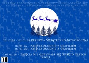 Wychodząc naprzeciw różnym potrzebom, i dzieci, i Rodziców (zwłaszcza przed świętami) zapraszam do udziału w grupowych zajęciach świątecznych organizowanych w Centrum Logopedyczno-Terapeutycznym „Dogadać się” w Grodzisku Mazowieckim w dniach 19,20,21.12.2018 oraz 27-28.12.18 w grupach wiekowych.
